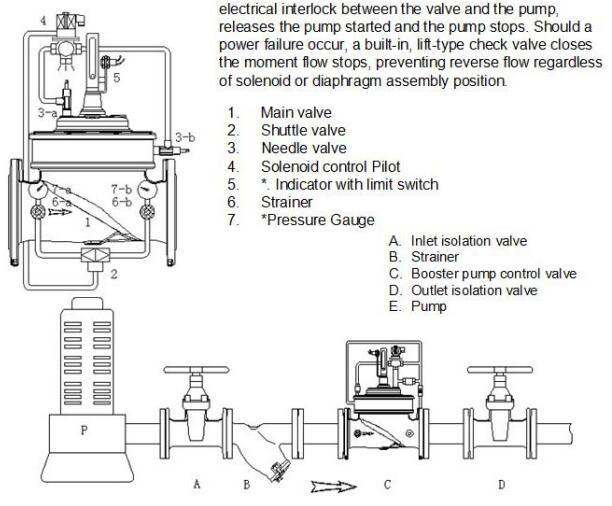 When the pump is opened, the solenoid valve receives the signal and the control valve slowly opens.