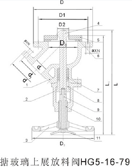 Glass-lined down-spread discharging valve is suitable for glass-lined down-spread discharging valve with design pressure P < 0.6 MPa and working temperature T < 150. The technical conditions of the valve shall comply with the requirements of HG5-16-79. Except phosphorus and phosphorus light medium, hydrofluorocarbon, hydrochloric acid, sodium hydroxide and potassium hydroxide, the valve can withstand various acid, alkali, salt solutions and organic solvents.