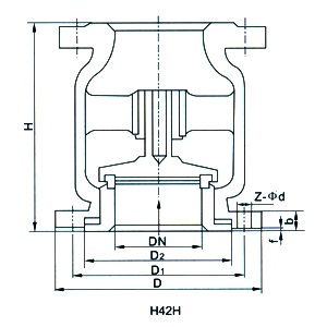 H42H、H42W立式止回閥正常處于關(guān)閉狀態(tài),由于管線中進口端介質(zhì)的壓力作用,而克服彈簧阻力使閥門開啟。當進口端介質(zhì)壓力低于出口端時,彈簧將閥芯推向閥座而使閥門關(guān)閉,阻止介質(zhì)逆流,故起止回作用。